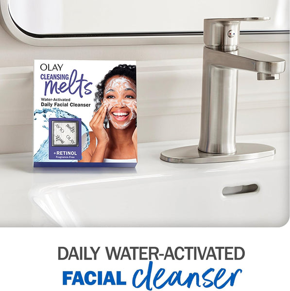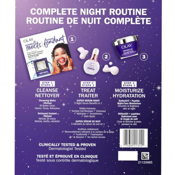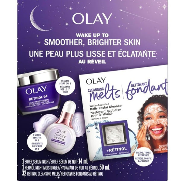Want to wake up to instantly brighter skin? With Olay Retinol 24 Night Moisturizer, you can see visible improvements in fine lines and wrinkles, smoothness, brightness, firming, dark spots, and pores. This face moisturizer absorbs quickly and goes deep into your skin’s surface layers so you wake up every morning to younger-looking, radiant skin.The face cream helps skin look smoother and firmer and is specifically formulated with anti-aging ingredients that hydrate skin for 24 hours. What makes Olay’s Night Repair Super Serum super? Our Super Serum hydrates to help skin’s natural repair process and contains 5 Night Serum Benefits in One:1. Faster surface cell renewal2. Visible correction of lines and wrinkles3. Reduced appearance of dark spots4. More even looking complexion5. Deep moisture overnight Our Concentrated yet lightweight and fragrance-free formula with 5 Powerful ingredients: Salicylic, Niacinamide, Lactic Acid, Glycerin, Peptide penetrates deep into your skin surface and absorbs quickly without leaving a sticky or tacky feeling, for healthier looking skin day 1. Clinically tested across diverse skin tones and types. Don’t forget to use SPF in the daytime to protect your skin from the #1 cause of premature aging – the sun. Ready for a new, way to clean your face? Check out NEW Olay Cleansing Melts + Retinol. A water-activated cleansing pad that dissolves into a dense, creamy microbubble lather that cleans, tones, and refreshes for a 3X better clean. One perfectly dosed pad delivers a luxuriously silky lather for a deep yet gentle clean to effectively remove dirt, oil, SPF and makeup, leaving you with a truly clean feeling. OLAY Cleansing Melts deliver 3-in-1 benefits to cleanse, tone, and refresh because who doesn’t love a multitasking skin care product?